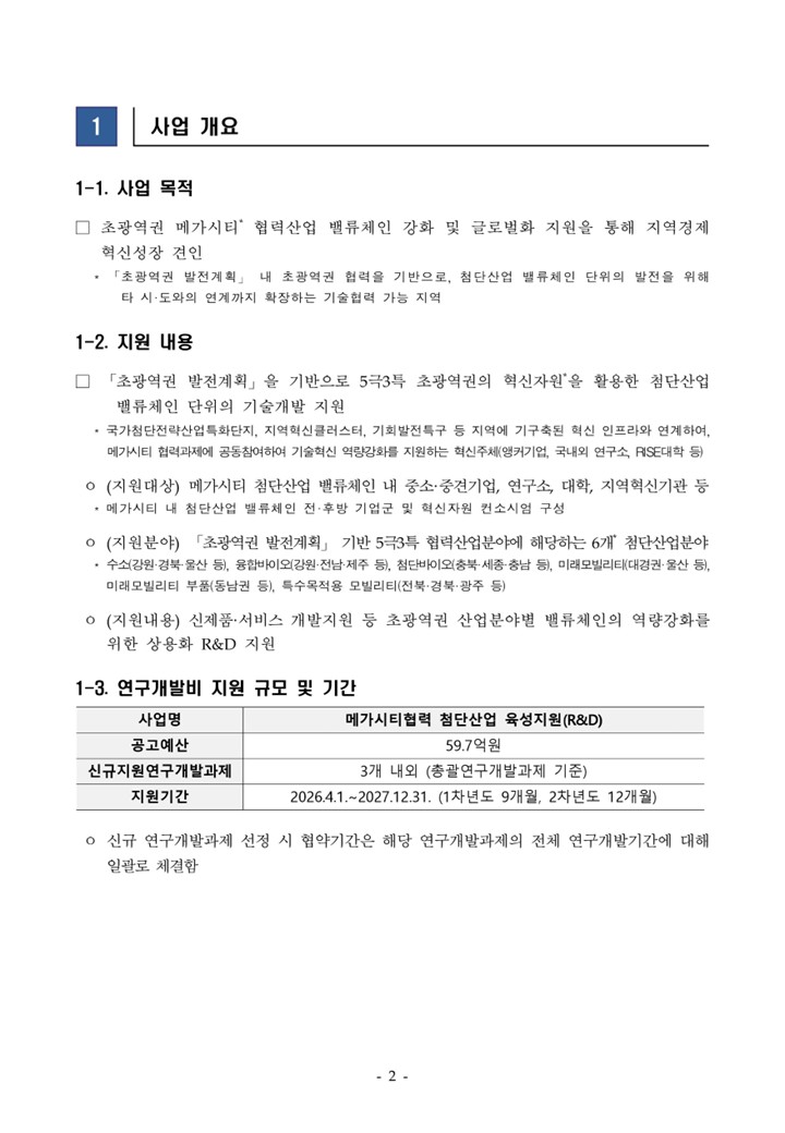 2026년 메가시티협력 첨단산업 육성지원(R&D) 신규지원 공고